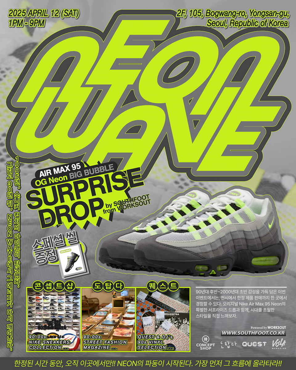To elevate this moment, the launch was executed as a pop-up boutique in collaboration with a tightly curated group of cultural partners: WORKSOUT (presented under the name ‘Southfoot’ as a teaser for the upcoming Air Max 95 x WORKSOUT collaboration), QUEST (a hideout venue rooted in Seoul’s underground scene), CONCEPTSHOP (a boutique specializing in ’90s–’00s Japanese streetwear), and DOTOPDA (an archive and print shop known for its collection of vintage fashion magazines).