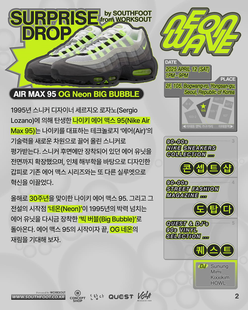In celebration of the 30th anniversary of the Air Max 95, Seoul was selected as one of the key global neighborhoods to launch the OG Neon ‘Big Bubble’.